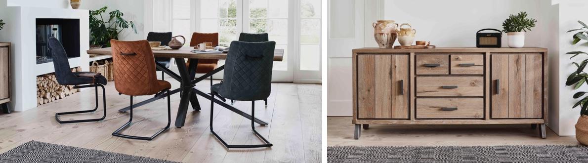Cool and contemporary urban style meets fabulous craftsmanship and creative details in the oak veneer and off-black weathered metal Habufa Philadelphia collection. Choose from a huge range of storage pieces, occasional tables, dining tables and dining sets. This collection thoughtfully offers pieces in multiple sizes, so whether you're furnishing a grand loft-like living space or a more compact dining room, you'll find the perfect fit for your industrial design look. Dining tables feature an authentic live edge and storage pieces incorporate the range's signature decorative metal panels. Habufa Philadelphia is exclusively available at Furniture Village.